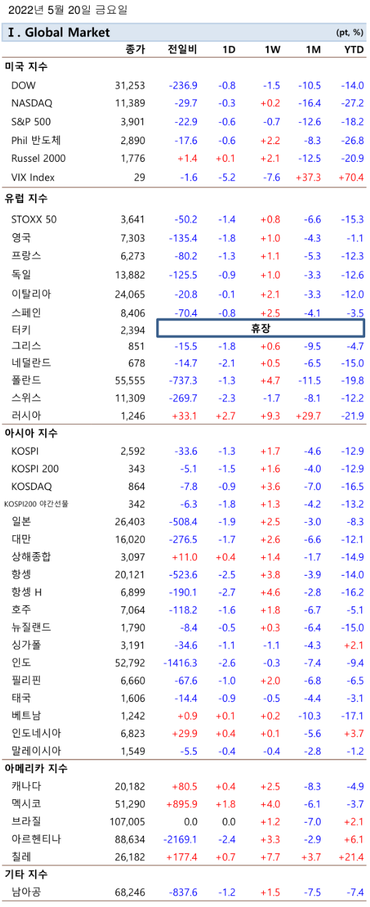 그럼에도 여전히 높은 인플레이션과 공급망 불안 해소까지는 시간이 걸릴 것이라는 점을 감안 투자심리가 크게 개선되지는 못함. 특히 높은 인플레로 인한 소비 감소 등으로 경기침체 이슈가 여전히 발목을 잡고 있어 장중 변동성은 확대되었고 옵션 만기일을 앞두고 있다는 점도 변동성 확대 요인.