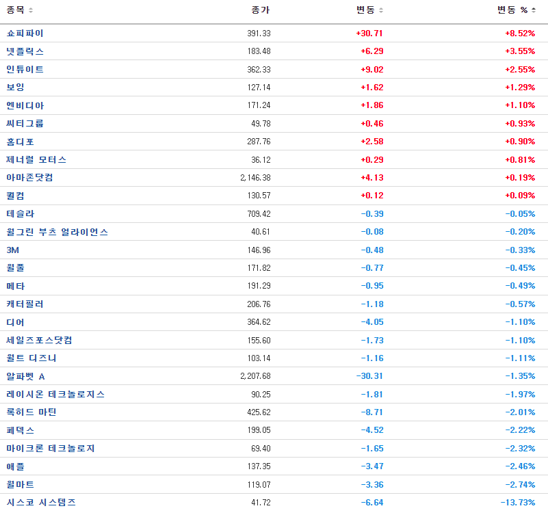 아마존(+0.19%)은 1분기 전자상거래 판매가 전분기 대비 1.6% 증가에서 2.4%로 상향 조정되었다는 지표 결과가 발표되자 상승. 엔비디아(+1.10%)는 목표주가 하향 조정 소식이 유입되었으나, 현재 주가 보다는 높다는 점을 감안 최근 하락이 과도했다는 인식 속 상승.