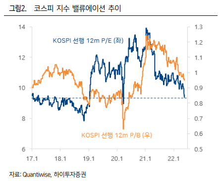 이미 9배 중반 수준으로 낮아진 코스피 선행 12개월 P/E 밸류에이션은 지수의 추가 하락을 제한한다. 1분기 코스피 기업이익은 우려에도 불구하고 선방했다. 2분기에는 러시아 전쟁과 원자재가 상승의 부정적 영향이 온기로 반영되지만, 이는 환율효과 역시 마찬가지다.