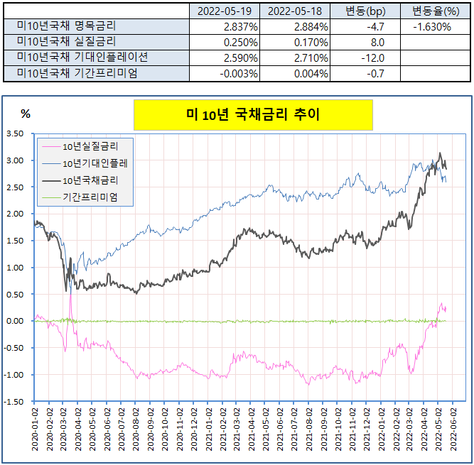 ■ 전일 뉴욕 채권시장국채금리는 장 초반 10년물이 2.77%대로 하락하는 등 경기침체 이슈가 부각되며 10bp 넘게하락 하기도 했음. 우크라이나사태 완화기대에 실질금리가 상승한 반면 기대인플레이션이 큰폭하락.