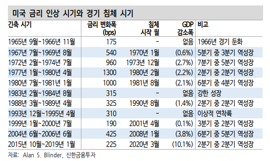 미국의 역대 경기 침체 흐름을 살펴보면 연준의 긴축이 선행됐다. 1960년대 중반 이후 총 11번의 통화 긴축을 경험한 기간 동안 1965년, 1984년, 1994년을 제외 한 8번의 긴축 과정에서 경기 침체를 경험했다.