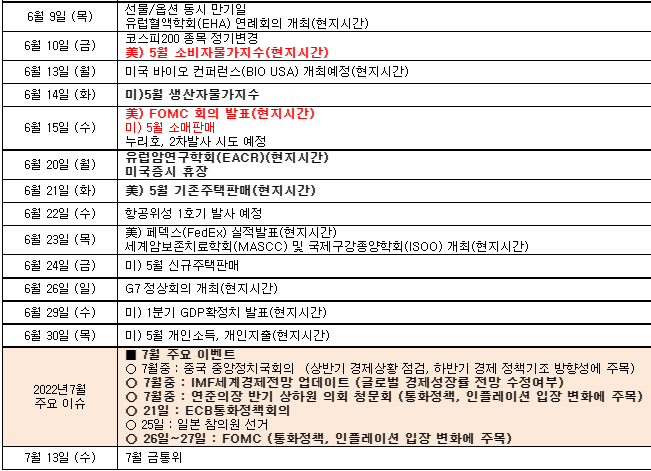 KOSPI는 연중 저점을 기록했다. 미국 5월 소비자물가 지표 발표 후 긴축 강도가 높아질 것이라는 우려가 부각됐기 때문이다. 금융시장은 6, 7월 FOMC에서 ‘자 이언트 스텝(75bp 금리 인상)’ 가능성을 반영하고 있다. 글로벌 증시는 예상보다 강한 물가에 스태그플레이션 우려도 일부 반영하고 있다. 높은 물가가 지속되면 빠른 긴축과 더불어 수요 위축도 야기할 수 있기 때문이다.