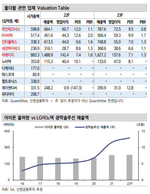 위 4개 기업들은 폴더블 관련 노출도가 60~95%에 달한다.(2022년 영업이익 기 준) IT 소비 수요 둔화 환경에서 차별화될 것이다. 2022년의 폴더블 출하량을 넘 어 2023년과 2024년을 주시해야 한다. 실적 개선은 내년에도 지속된다.