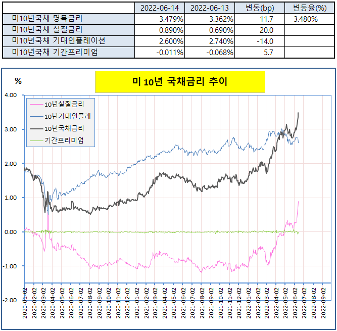 ■ 전일 뉴욕 채권시장 : 국채금리, FOMC 앞두고 75bp 인상 기대로 급등국채금리는 높은 수준의 생산자물가지수 발표 후 상승세를 보였으며, CME FedWatch를 통해 6월 FOMC에서 75bp 인상 확률이 97%를 기록하는 등 확실시 되자 급등.