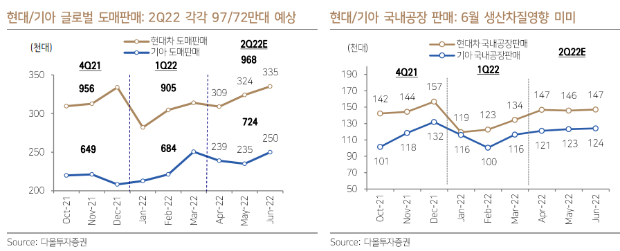 ● 파업손실 제한적, 2022 글로벌 판매량에 미치는 영향 미미 금번 화물연대 파업으로 인해 발생한 생산차질은 현대/기아 양사 약 5천대 내외에 그칠 것으로 추정되며, 최근 주가하락을 통해 나타난 체감상 수치대비 상대적으로 양호할 것으로 판단. 양사 월별 국내생산대수가 5월 기준 각각 14.6만대, 12.4만대 수준인 점을 감안시 6월 잔여기간 동안 특근 대응을 통해 충분한 만회 기회가 존재하고, 월별 글로벌 판매량에서 대비로는 약 1.5%의 판매손실에 그칠 것으로 예상.