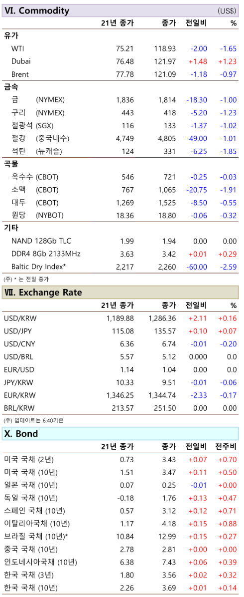 금은 국채 금리 급등 여파로 매물 출회되며 하락. 구리 및 비철금속은 연준의 공격적인 금리인상 가능성과 달러 강세 여파로 하락. 곡물은 금융시장 하락 압력과 FOMC를 앞두고 매물 출회되며 하락. 중국 상품선물시장 야간장에서 철광석은 0.28%, 철근은 1.65% 하락.