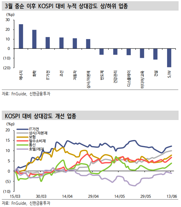 3월 중순 이후 ‘3고(환율, 금리, 유가)’가 상수가 됐고 고유가 수혜 또는 수요가 강한 업종의 주가 흐름이 양호했다. 변동성 완화 시 업종 접근에 대한 지표로 KOSPI 대비 상대강도를 활용할 수 있다. 최근 상대강도가 반등하는 업종은 매크 로 노이즈 방어력이 기대되는 업종으로 볼 수 있다. 성장주 중 방향성이 명확한 일부 2차전지(IT가전)와 종합상사와 방산이 포함된 상사/자본재, 전통적인 방어 주인 보험, 통신의 접근이 합리적일 것으로 본다. 필수소비재는 비용 전가력을 고려해야 하고 호텔/레저 중 방어주 성격을 지닌 카지노를 주목할 만하다.