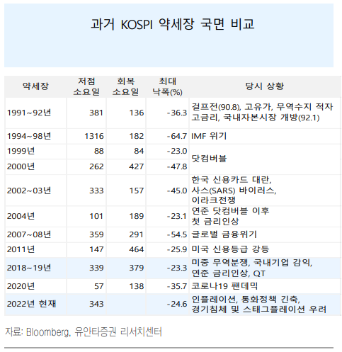 6월14일 장 초반 KOSPI가 2,450pt대까지 밀리며 연저점을 경신. KOSPI는 종가기준 지난해 고점 이후 전일까지 343일간 -24.6%의 하락을 기록. 지난 2018~19년 미중 무역분쟁 국면 약세장과 유사한 수준. 인플레이션의 등장과 긴축의 강도가 차이점. 경기침체의 현실화가 추가 하락 리스크 요인이나, 현재로서는 KOSPI가 반영할 수 있는 악재는 반영됐다는 판단.