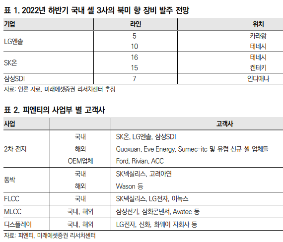 주요 경쟁사는 일본 업체인 히라노와 도레이. 경쟁사들과의 기술 격차 없으며 국내 셀 업체들의 M/S를 가져오고 있는 것으로 파악. 배터리 스펙은 상향 조정되고 있어 기존 밸류체인에 있는 피엔티는 락인효과를 누릴 것.