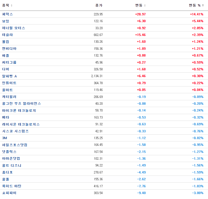 페덱스(+14.41%)는 행동주의 투자자와 합의하며 배당금을 인상하고 이사를 추가하자 급등.