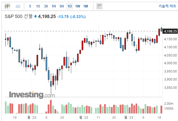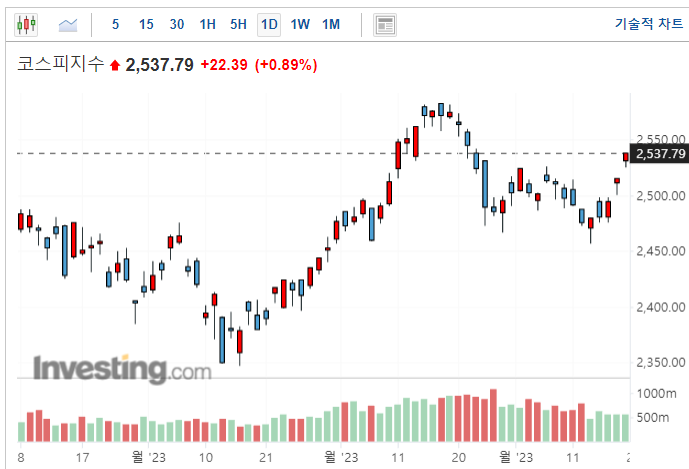 금요일 한국증시는 앞선 미국증시에서 미국의 부채한도 협상 기대감, 엔비디아 CEO의 AI산업에 대한 긍정적 전망, 일본의 마이크론 보조금 지급 등의 호재에 필라델피아 반도체 지수 강세분위기가 한국증시에 그대로 반영되며 상승출발 후 외인의 선물, 현물 순매수가 이어지면서 코스피 +0.89%, 코스닥 +0.70%로 마감.