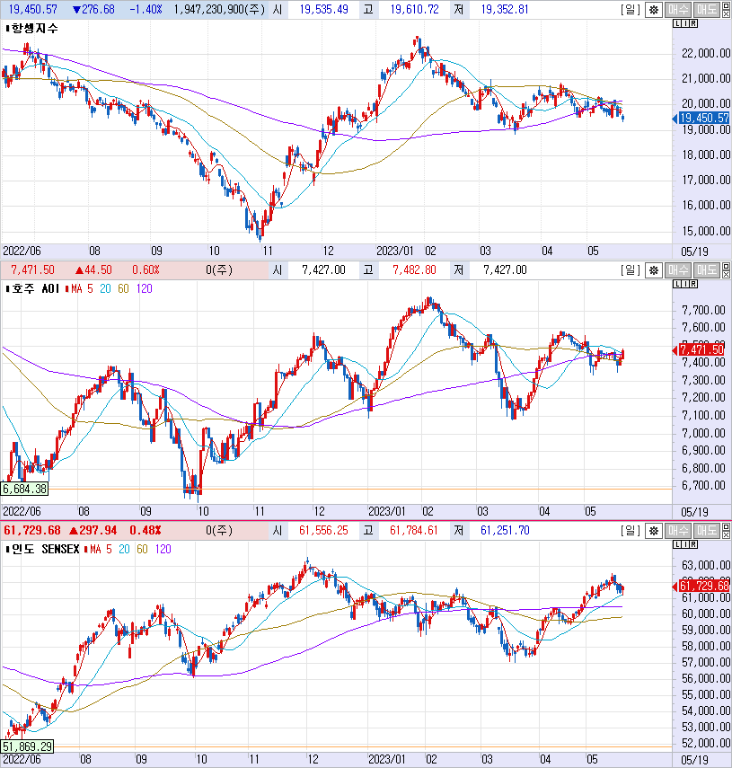 19일 중국증시 주요지수는 앞선 미국시장에서 미국부채한도 협상 낙관론에도 중국 경기에 대한 우려에 혼조세를 나타냈다. 상하이 지수는 장중 잠시 반등했으나 대체로 하락세를 보였다. 선전 지수는 하락 출발했다가 장중 상승 전환했다. 업종별로는 금융·엔터테인먼트·부동산 업종이 가장 큰 폭으로 하락했다. 홍콩증시는 알리바바그룹 실적 부진에 중국 경제에 대한 우려가 지속되면서 하락했다.