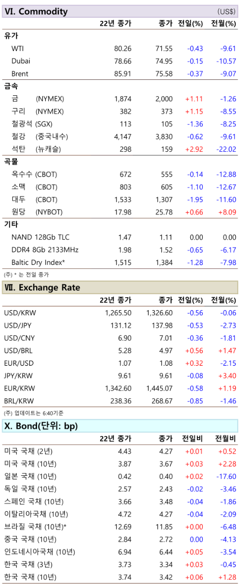 ■ 전일 뉴욕 상품시장 : 주간 천연가스 14% 급등 Vs. 곡물 5% 내외 하락국제유가는 장중 파월 연준의장의 금리동결 시사 등으로 달러화가 약세를 보이자 한때 2% 넘게 상승. 그러나 부채한도 협상에 대해 공화당이 회담장에서 퇴장하자 불확실성이 부각되며 하락전환. 한편, 경기침체 우려 속 수요부진 가능성이 여전히 진행되고 있어 하락요인에 민감한 반응을 보인 점도 특징.
