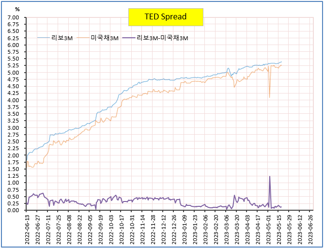 ■ 전일 뉴욕 채권시장국채금리는 장중 파월 연준의장이 금리동결을 시사하자 하락하기도 했으나, 부채한도 협상이 일시 중단되자 상승세로 전환. 특히 2개월물이 무려 26bp나 폭등했으며 1개월물도 5bp 상승. 그렇지만, 2년물은 파월 발언을 소화하며 제한적인 상승에 그쳤음.
