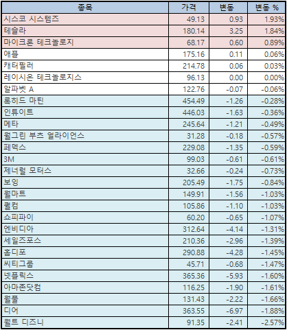 ■ 주요종목 : 반도체, 소비재 하락디즈니(-2.57%)는 일부 투자회사가 스트리밍 서비스 성장을 둘러싼 불확실성을 이유로 투자의견을 중립으로 하향 조정하자 하락. 넷플릭스(-1.60%), 워너브라더스 디스커버리(-1.61%) 등도 동반하락.