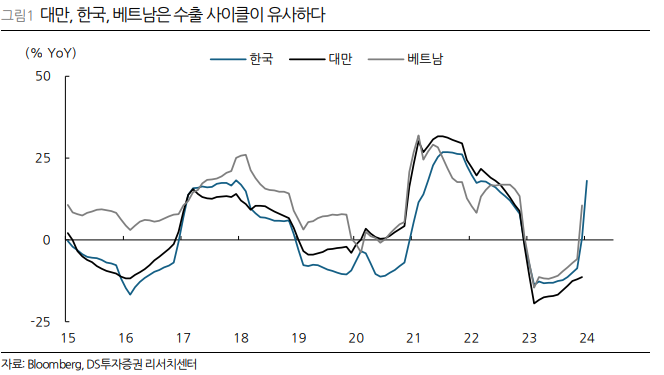 시장 내부구조(배당이나 주주환원과 같은 내부적으로 결정되는 가치)를 제외하더라도 한국시장은 대만 및 베트남보다 부진하다. 해당국들은 모두 수출이 경기 순환과 수요에 미치는 영향이 큰 국가들로 수출 순환 사이클도 매우 비슷하게 움직인다. 그 런데 동반해서 수출이 부진하고 회복 중임에도 주식시장은 한국이 유독 부진하다