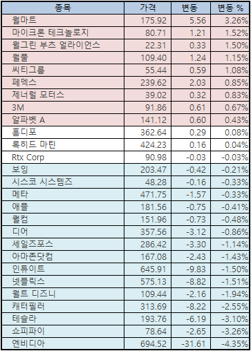 스마트 TV 업체인 비지오(+16.26%)는 월마트의 23억 달러 규모 인수 발표 후 급등. 캐터필라(-2.54%)는 에버코어가 목표주가를 상향 조정했지만, 투자의견을 하향 조정하자 하락. 일라이릴리(-3.38%), 노보노디스크(-2.06%) 등 비만 치료제 업종 등도 차익 실현 욕구 속 하락.