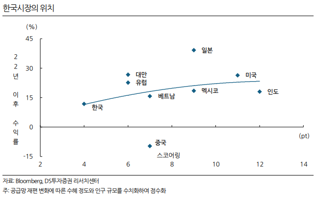 일본은 양쪽에 모두 해당하는 국가로 수익률이 가장 높은 국가 중 하나다. 대만은 IT 중심 국가로 미국 공급망에 직접적인 수혜를 보고 있다. 베트남은 내수 규모가 어느 정도 있는 국가이며 공급망 변화에도 일정 부분 수혜를 보고 있다. 반면 한국은 내수의 규모나 성장이 약하고 공급망도 경기가 부진한 중국의 비중이 아직 높다.