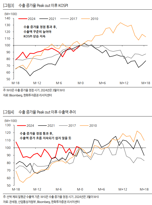 KOSPI와 수출 증감률은 비슷한 궤적으로 움직이기 때문에 수출 증가율 정점 통과는 주식시장 조정요인으로 작용할 수 있다. 최근 3차례 수출 증가율 정점통과사례를 보면, 2010년 당시 KOSPI는 수출 증가율이 정점을 통과한 후에도 꾸준히 상승한 반면, 2017년과 2021년 주가는 수출 증가세가 둔화되자 상당기간 직전수준을 하회했다. 수출액 추세가 시장 방향을 결정하는 핵심요인이었다.