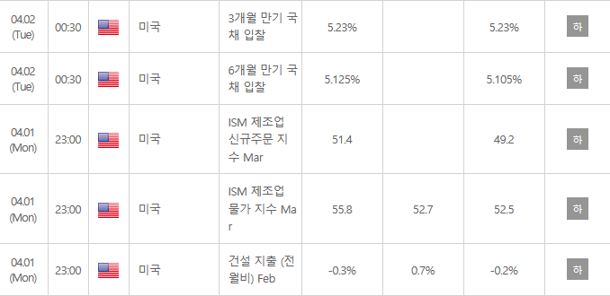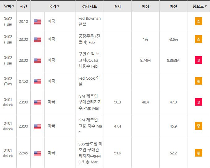 - 미국 ISM 제조업 구매관리자지수(PMI) Mar 50.3 :기대치이상, 써프라이즈
