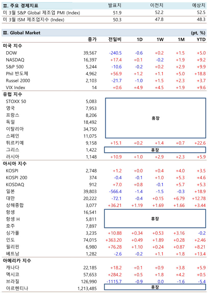 1일 뉴욕증시는 지난 금요일 발표된 PCE 가격지수가 양호한 가운데 상승 출발했지만, 장중 견고한 ISM 제조업 지수가 발표된 이후 국채금리가 급등하자 매물 출회되며 하락. 더불어 이스라엘이 시리아 주재 이란영사관 공격에 중동 리스크 확대도 부담.