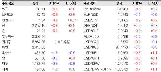 ■ 전일 뉴욕 상품시장국제유가는 이스라엘이 시리아에 있는 이란 대사관 주변을 공격하며 외교관 등 8명의 사망자가 발생하자 중동 리스크 확대 우려로 상승. 더 나아가 미국과 중국의 제조업 지표 개선에 따른 수요 증가 기대 심리도 우호적. 다만, 달러강세에 상승을 제한.