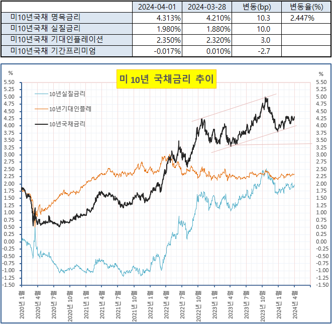 ■ 전일 뉴욕 채권시장 : 견고한 경제지표를 반영하며 급등미 국채금리는 ISM 제조업지수가 견고하고 물가지수를 비롯한 세부항목도 양호한 결과를 내놓자 급등. 특히 이를 반영하며 CME FEDWatch에서는 6월 금리인하 확률이 70%에서 58%로 크게 낮아지는 등 금리인하 시기 지연가능성이 부각.