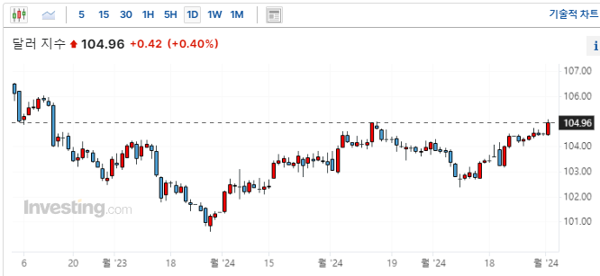 이를 통해 미국경제는 여전히 견고하며 물가도 생각보다 느리게 낮아지고 있다는 점이 부각돼 달러가 강세를 보이고 국채금리는 급등. 실제 CME FedWatch에서는 5월 금리동결 확률이 98%를 기록하고 6월 금리인하 확률은 70%에서 58%로 둔화.
