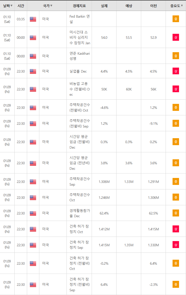 9일 뉴욕시장에서 발표된 비농업고용보고서에서 일자리수가 에상보다 부진하게 발표된 반면 실업율은 전월치 예상치보다 호조를 보임. 상호관세 위법판결이 나오지 않으면서 투자자들은 고용지표를 확인하는 모습을 보였고 비농업고용수보다 실업율에 주목하였음. 주택착공건수, 건축허가면적은 지연된 데이터를 발표하며 9월치는 상승하고 10월에는 하락였으나 예상치에 미치지 못하였음. 1월 미시건대 소비자심리지수는 예상치와 전월치를 상회하며 호조를 보였음
