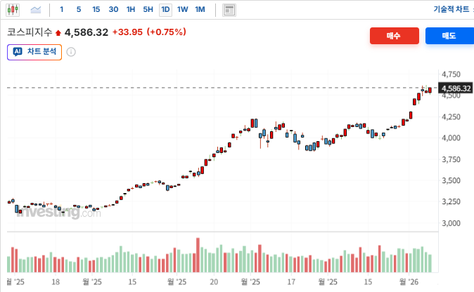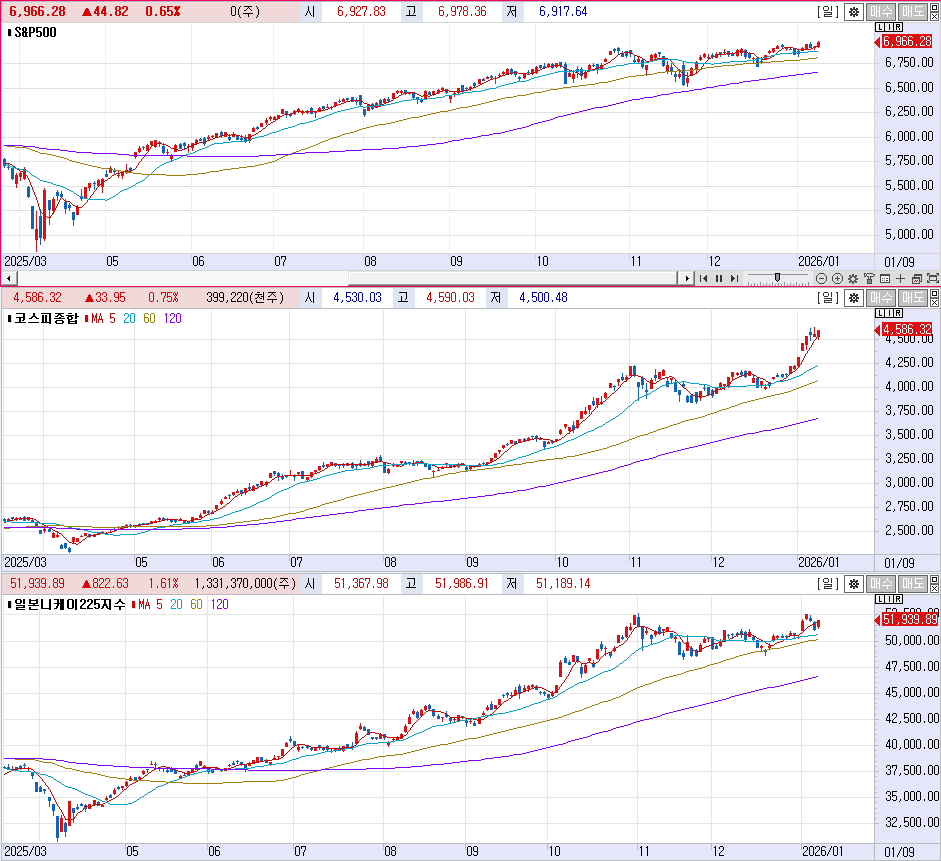 오늘 코스피는 +0.7% 내외 상승출발 후 주말에 있었던 이란 소요사태에 대한 미국의 개입가능성, 미국의 그린란드 확보추진, 대만에 대한 중국의 군사적 압박 등 지정학적 위험을 소화하고 이번주에 예정된 JP모건 헬쓰케어컨퍼런스, 한-일 정상회담, 트럼프 상호관세 위법판결 가능성을 기대하며 추가상승을 예상.