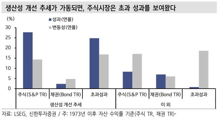 이 조합은 과거 금융시장, 특히 주식시장에 우호적으로 작용했다. 생산성 가속화 국면(Trend대비 z-score 0.5 이상, ULC 2.5% 이하)에서 주식(S&P500 Total Return)은 채권(Bloomberg aggregate Total Return)을 연율 기준 20%p대 상회했 다(1973년 이후 분기 성과의 연율 기준). 반면 생산성 가속화를 수반하지 않았던 이외 국면에서 주식은 채권을 0.8%p 앞서는데 그쳤다. 변동성까지를 고려했을 때는 오히려 채권 성과에 밀리기도 했다. 채권대비 주식 초과성과 변동성은 생산 성 개선 때와 아닐 때 각각 16.8%, 18.7%였다. 따라서 주식의 절대 및 상대수익 률, 샤프비율(변동성 고려한 성과)은 모두 생산성 개선 국면에서 양호했다.
