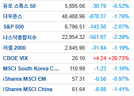 투자자들의 지정학적 우려로 인해 증시는 광범위한 매도세에 직면했으며, 저가 매수 심리가 뚜렷하게 나타나지 않아 주요 지수들은 장 마감까지 최저치를 경신하며 하락세를 이어갔음. S&P 500 지수 구성 종목 중 10개 업종이 하락했으며, 그중 7개 업종은 1.0% 이상, 6개 업종은 2.0% 이상 하락하며 마감.금 선물은 투자자들이 안전자산으로 몰리면서 온스당 170.40달러(3.7%) 상승한 4,765.80달러에 마감. CBOE 변동성 지수는 28.8% 급등한 20.42를 기록하며 오늘 시장 전반의 불안감을 드러냈음.