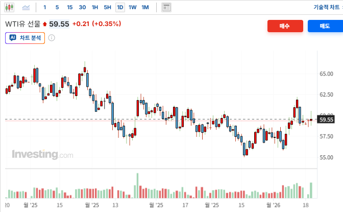 ■ 전일 뉴욕 상품시장WTI는 지정학적 리스크와 공급 불안이 맞물리며 변동성 장세를 보인 끝에 배럴당 $60.30~$60.62선으로 전 거래일 대비 약 $1.18(+1.99%) 상승 마감. 중앙아시아의 주요 산유국인 카자흐스탄의 최대 유전(텐기즈, 코롤레프) 인근 발전 시설에서 화재가 발생해 일시적으로 생산이 중단된 소식은 시장에 즉각적인 공급 불안을 야기하며 유가 반등의 강력한 촉매제가 됨. 달러인덱스가 하락하면서, 달러로 결제되는 원유가격이 상대적으로 저렴해 보이는 효과가 나타나 유가 상승을 뒷받침. 지정학적 긴장과 '그린란드 관세' 여파로, 글로벌 무역 전쟁 공포가 확산되면서 단기적으로 에너지 수요 둔화 우려를 낳아 장 초반 유가를 $59 아래로 끌어내렸으나, 이후 안전 자산 선호 및 지정학적 불안이 부각되며 저가 매수세가 유입되며 상승.