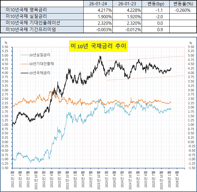 미 국채 금리 하락, 달러인덱스 하락, 달러대비 원화강세는 한국증시에 우호적이지만 주말 사이 일본 금융당국에서 물가압력에 대응하기 위한 매파적 금리인상 선호 발언이 나오며 엔/달러 환율이 153엔대까지 급락. 엔화강세에 따른 일본증시 하락과, 엔캐리청산우려가 더해지며 아시아증시가 동반 하락압력을 받는 상황. 뉴욕시간 27~28일로 예정된 1월 FOMC에서 금리동결 전망이 강화되었음에도 미 국채 10년물 금리가 4.2%대 초반까지 내려온 것은 금리동결이 이미 기정사실화되어 있는데다가 컨퍼런스보드 경기선행지수 역성장에 따른 향후 경기 둔화 가능성과, 글로벌 안전선호심리 확대상황을 동시에 반영하고 있음.