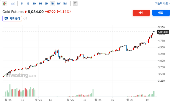 - 금(Gold) : 역사상 처음으로 온스당 5,000달러를 돌파하며 5,089.78달러에 마감함. (장중 5,110.50달러 기록)