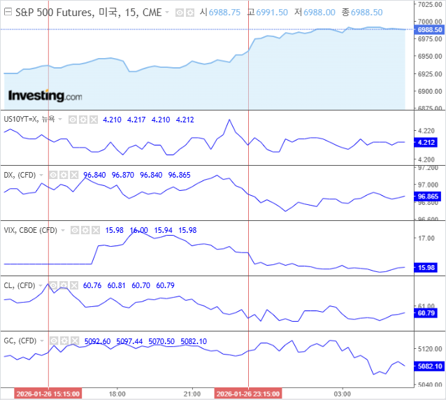 14:00 (정부 셧다운 우려): 1월 31일 예산안 마감 시한을 앞두고 미 의회의 갈등이 격화되었다는 뉴스가 전해지며 투자 심리가 위축되었음. 불확실성을 회피하려는 차익 실현 매물이 출회되며 지수 하방 압력이 강화되었음.