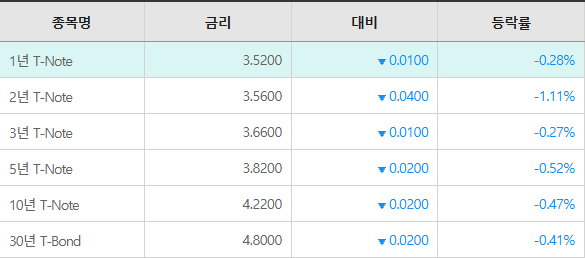 달러약세와 안전자산 선호 심리가 맞물리며 미 국채 금리는 전반적으로 하락세를 보였음. 엔화 강세에 따른 글로벌 자금 흐름의 변화와 이번 주 예정된 FOMC 회의를 앞둔 포트폴리오 조정이 금리 하락을 유도했음.