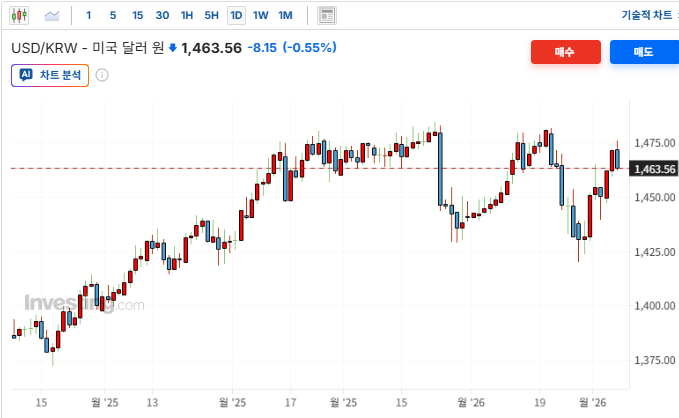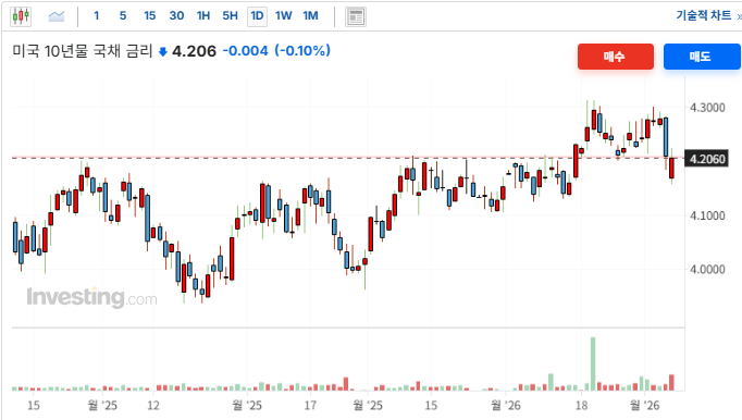 > 장 중반 (11:00 ~ 13:00) 되돌림 : 상승 폭을 일부 반납하며 5,260~5,270선 사이에서 횡보하거나 소폭 하락함. 원/달러 환율이 1,466.50원까지 급등하며 외국인 투자자들이 코스피 시장에서 순매도로 전환, 지수의 추가 상승 동력을 일시적으로 억제함. 미 10년물 국채 금리가 4.21%로 재상승함에 따라 고점 부담이 있는 대형 성장주 및 일부 바이오주에서 차익 실현 매물이 출회됨.