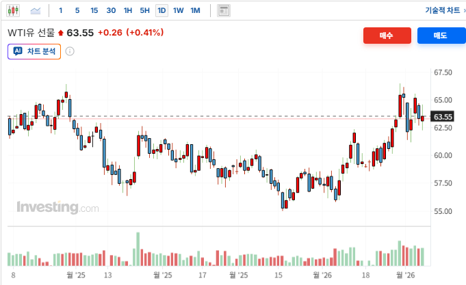 ㅇ WTI 유가( -0.89%) : 오만에서 열린 미국과 이란 간의 고위급 핵 협상 소식이 전해지며 중동 지역의 공급 중단 우려(전쟁 프리미엄)가 크게 완화되었음. 국제에너지기구(IEA)와 미 에너지정보청(EIA)이 2026년 글로벌 원유 생산량이 수요를 초과할 것이라는 공급과잉 리포트를 발표하며 하방 압력을 가했음. 사우디아라비아가 아시아향 공식 판매 가격(OSP)을 2020년 이후 최저 수준으로 인하하며 수요 둔화 우려를 자극했음.