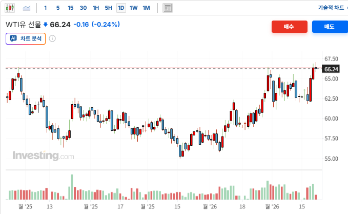 ㅇ WTI 유가는 미국이 핵 협상 중인 이란을 상대로 조만간 무력을 행사할 수 있다는 우려가 재점화되며 전일대비 배럴당 $0.08(0.12%) 상승한 $66.48에 마감