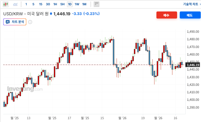 미 연방대법원의 위헌 판결로 인해 그동안 달러강세를 견인했던 관세에 의한 인플레이션 압력이 완화될 것이라는 기대감이 형성되며 달러화가 약세로 전환됨. 미국 국채 수익률 곡선이 가팔라지는(Steepening) 현상이 나타났으나, 주요 수출국(한국, 일본 등)의 상호관세 부담 완화 전망이 상대적 통화가치 하락을 방어하며 달러약세를 유도함. 다만 트럼프 대통령의 즉각적인 대체관세 부과 선언과 이란에 대한 군사적 긴장 고조가 안전자산인 달러의 추가하락을 방어하는 요인이 됨.