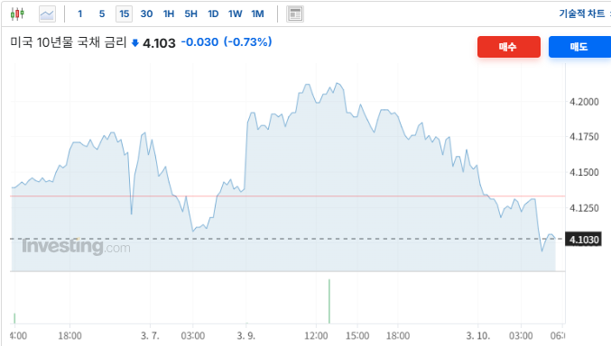 장 초반 이란 전쟁 격화와 유가 폭등으로 인해 10년물 금리가 4.19%대까지 치솟으며 인플레이션 공포를 반영함. 그러나 트럼프 대통령이 SNS를 통해 "에픽 퓨리 작전이 일정보다 앞서고 있으며 전쟁이 거의 끝났다"고 선언하자, 지정학적 불확실성이 급격히 해소되며 안전자산인 국채로의 매수세가 유입됨.또한 G7 재무장관 회의에서 에너지 시장 안정을 위한 공동 대응 의지를 표명한 점이 금리 하방 압력으로 작용함.