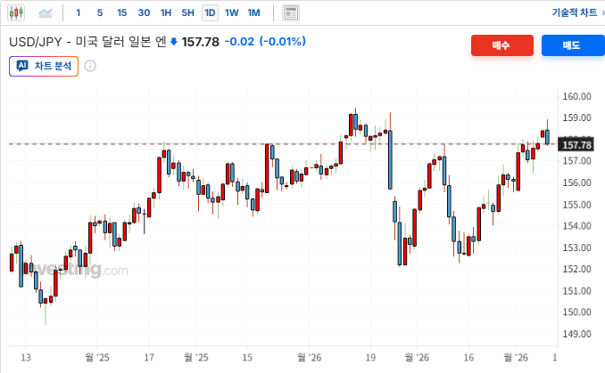 ㅇ 엔/달러+0.15% : 전쟁 종결 기대감에 따른 안전자산(엔화) 기피 현상 지속. 일본은행(BOJ)의 완화적 태도 재확인과 미-일 금리 차 부각으로 엔화 가치 하락(환율 상승)이 진행됨.