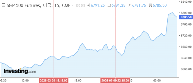 >03:00 ~ 06:00 (폭발적 상승 및 마감): 장 마감을 앞두고 트럼프 대통령이 "이란의 군사 역량이 사실상 궤멸되었다"고 재차 강조하며 '단기전 종료'에 쐐기를 박음. WTI 유가가 84.59달러(-19.20%)까지 수직 하락하며 스태그플레이션 공포가 완전히 해소됨. 미 국채 10년물 금리가 4.09%(-2.38%)까지 떨어지자 기술주 중심의 강력한 매수세가 지수를 끌어올려 최종 **6789.75(+2.16%)**로 마감함.ㅇ 9일 뉴욕증시 변화요인