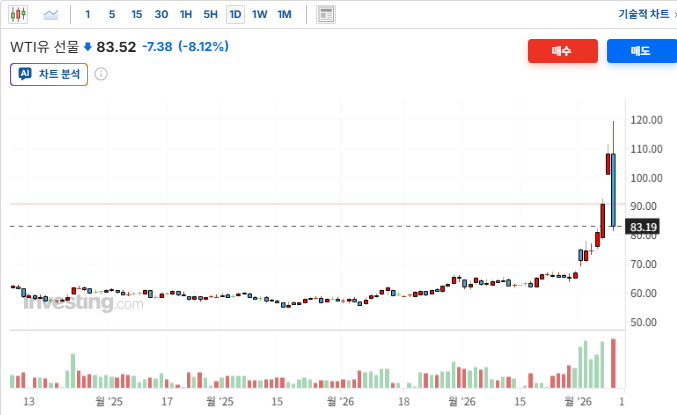 ㅇ WTI 유가+5.22% : 오늘 오전 증시 핵심 변화 요인. '전쟁 종료 시사'로 84달러선까지 폭락했던 유가가 호르무즈 해협 장악 언급 및 실질적 공급망 차질 우려로 인해 아시아 장에서 급격한 기술적 반등을 보임.