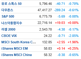 ■ 전일 뉴욕증시ㅇ 다우 -0.61%, 나스닥 +0.08%, S&P500 -0.08%, 러셀2000 -0.17%, VIX -2.85%, 필 반도체 +0.63%