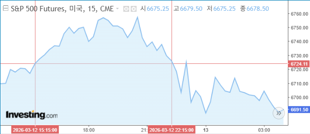 ㅇ 다우 -1.56%, 나스닥 -1.78%, S&P500 -1.52%, 러셀2000 -2.06%, VIX +12.56%, 필 반도체 -3.43%.3월 12일 선물지수는 양호한 경제지표로 유럽장 초반 장 초반 반등을 시도했으나, 강력한 고용에 따른 긴축 우려와 중동발 유가 폭등 및 신용 리스크가 결합되며 장 후반으로 갈수록 하락 압력이 거세지는 흐름을 보임. 이란 지도부의 호르무즈 해협 봉쇄 유지 발표로 WTI가 배럴당 96.35달러(+3.88%)까지 폭등하며 스태그플레이션 우려가 시장을 압도함. 주간 신규 실업수당 청구 건수가 21만 3천 건으로 예상치를 하회하며 노동 시장의 견조함을 증명하자, 미 10년물 국채 금리가 4.265%(+0.71%)로 상승하며 기술주에 하방 압력을 가함.
