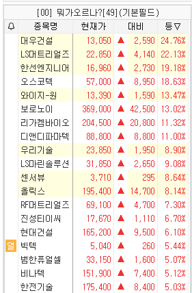 삼성물산 +0.18%, 현대건설 +5.14%, 대우건설 +17.78%, 한국전력 +1.68%, 두산에너빌리티 +2.80%, 비에이치아이 +3.91%, 우리기술 +11.64%, 태웅 -0.51%, 우진엔텍 -0.71%, 한전KPS +0.33%, 한전기술 +6.41%, 범한퓨얼셀 +13.47%, 두산퓨얼셀 -0.43%, HD현대에너지솔루션 -6.58%, OCI홀딩스 +0.06%, 한화솔루션 -7.74%, 씨에스윈드 +1.43%, 씨에스베어링 -1.93%, SK오션플랜트 -1.74%, HD현대일렉트릭 -1.48%, 효성중공업 +1.13%, LS ELECTRIC +0.68%, 산일전기 -2.23%, LS마린솔루션 +12.67%, 대한전선 -0.83%