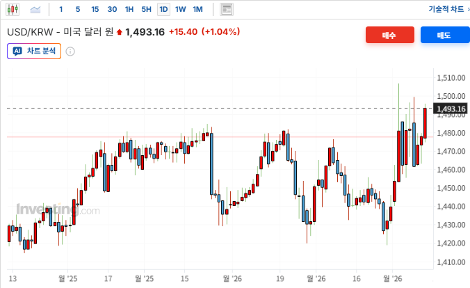 호르무즈 해협 봉쇄에 따른 한국의 에너지 수입 비용 급증 및 경상수지 악화 우려가 원화 약세를 부추김. 글로벌 위험 회피(Risk-off) 심리가 강화되며 외국인 투자자들이 국내 증시에서 자금을 회수함에 따라 환율이 1493.00원까지 치솟음. 환율 급등은 수입 원가 상승으로 이어져 국내 제조 기업들의 수익성을 악화시키며 한국 관련 ETF 및 역외 시장에서의 투자 심리를 위축시킴.