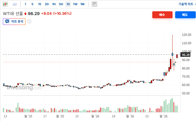 ㅇ WTI 유가는 이란 최고지도자 모즈타바가 호르무즈 해협 봉쇄 지속을 선언하고 전선 확대 의지를 내비치며 전일대비 배럴당 $8.48(9.72%) 상승한 $95.73에 마감
